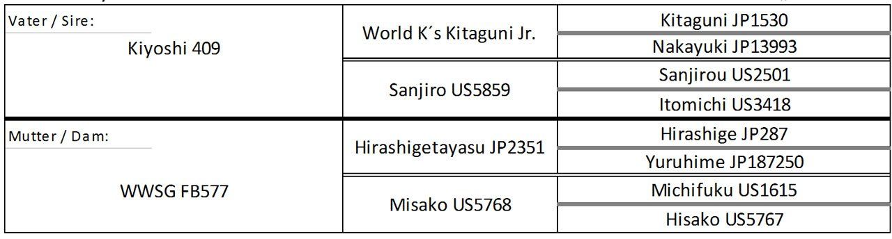 Kiyoshi 27 wurde nach der Takeda Rotationszucht entwickelt. Sein Pedigree Kiyoshi x Hirashigetayasu 001 x Misako vereint das Beste aus den verschiedenen Linien - Shimane, Kedaka und Tajima - in einem Pedigree.