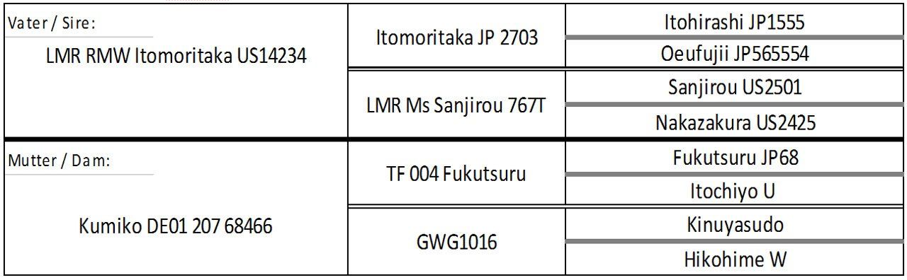 Moto Moto ist ein typstarker Wagyu-Fullblood-Bulle mit sehr guter Bemuskelung. Er hat mit LMR RMW Itomoritka und JVP Fukutsuru 068 zwei Bullen im Pedigree die Größe, Exterieur sowie Marmorierung und Fleischqualität vereinen. Moto Moto ist Träger der bevorzugten Exon 5 Variante BC. Er eignet sich sowohl für den Einsatz in der Reinzucht, als auch für die Belegung für die F1-Produktion. Moto Moto ist frei von allen bekannten Erbfehlern. -