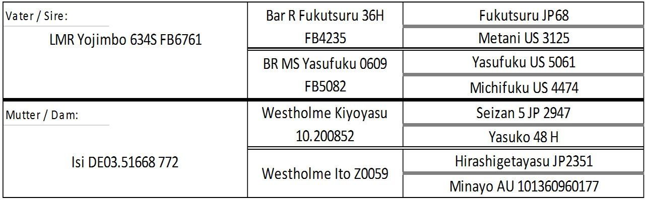 Sei Vater LMR Yojimbo ist in den USA für 35.000 $ vom Züchter verkauft worden! Er hat bei dem GeneSTAR-Test für alle vier Marbling-Genmarker und alle drei Tenderness-Genmarker vererbbare Resultate! Dabei weist er in seinem Pedigree die Tajima-Blutlinie mit 81% auf. Diese steht für sehr gute Marmorierung.