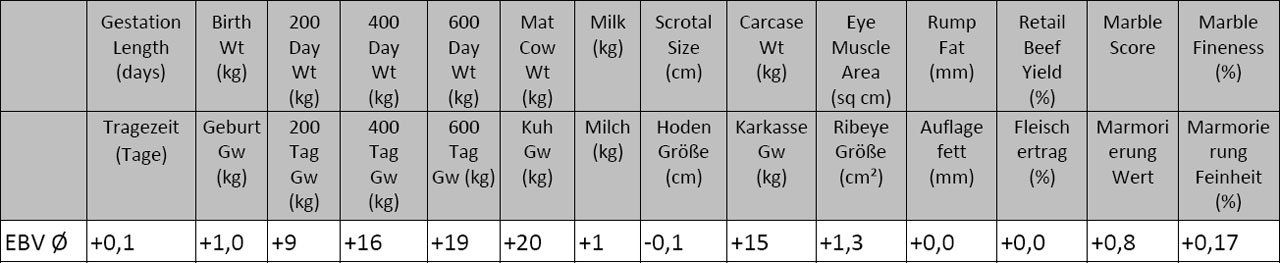 EBV’s (Estimated Breeding Values) sind geschätzte Zuchtwerte für Fullblood Wagyu-Rinder. Mit Hilfe der EBV Werte lassen sich Tiere gut mit der gesamten Population vergleichen. Die Daten zu den Tageszunahmen, Milchmenge, Schlachtgewichten, Marmorierung, etc. werden unter standardisierten Bedingungen erfasst. Diese EBV Werte werden in bestimmten Maßeinheiten als positive oder negative Zahl dargestellt. Ein Bulle mit einem EBV von beispielsweise +50kg für ein 600 Tage Gewicht hat einen geschätzten genetischen Mehrwert von 50kg über der Basis von 0. Der Basiswert bzw. der durchschnittliche EBV Wert verändert sich stetig aufgrund des genetischen Fortschritts der Rasse. Die Sicherheit der Daten steigt mit der Anzahl der untersuchten und geschlachteten Tiere. Alle Merkmale mit den durchschnittlichen australischen EBV Werten für die Fullblood Wagyu-Population sind in der Tabelle dargestellt